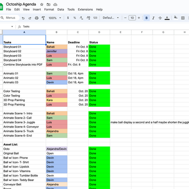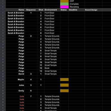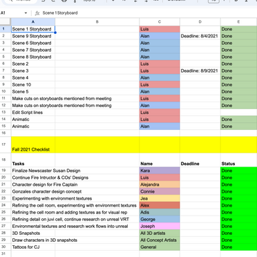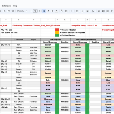 Chart for statuses of all scenes and shots in production and who was in charge of each one, along with polishing