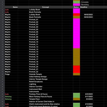 Chart for status of concept designs of props, creatures, characters, and settings, and who was assigned to them.