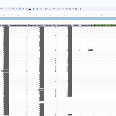 This is a chart of listed purchases for tickets for the Danzantes Unidos festival, along with additions like Pachanga, T-shirts, and our nightly showcases